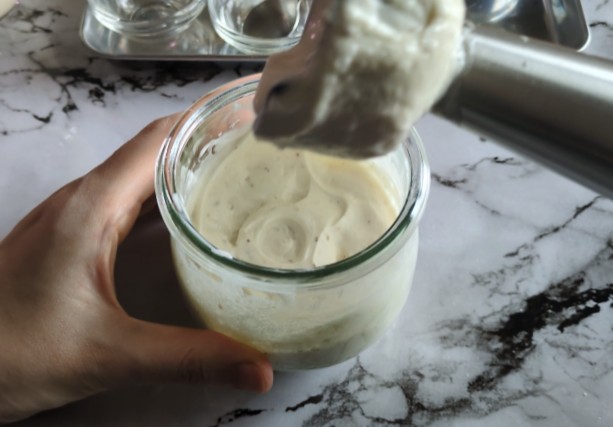 1.容器に豆乳、塩麹、マスタードを入れ、ハンドブレンダーでしっかりと攪拌する。