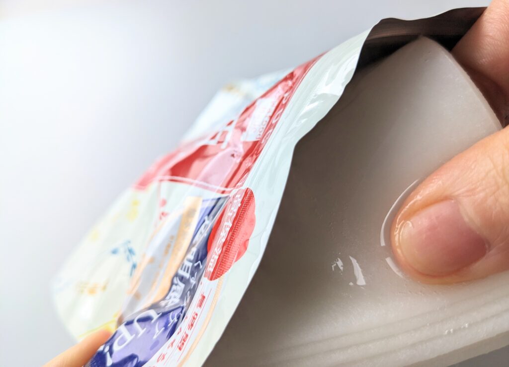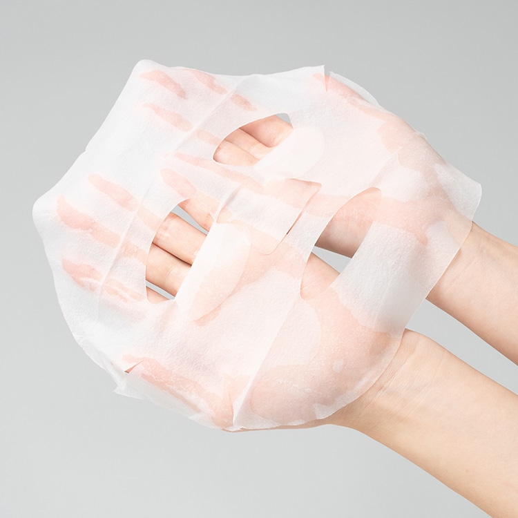 たっぷりうるおいを抱え込む肌触りの良い3層シート構造。美容液の保水力にこだわり、レーヨン100%ではなく保水性の高いパルプを挟んでいるから、こんなにひたひた!