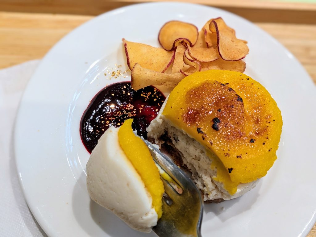 秋の新作では、レアチーズケーキの上に国産さつまいもを使用した植物由来の自家製クリームが乗っており、表面はカリッとブリュレされています。