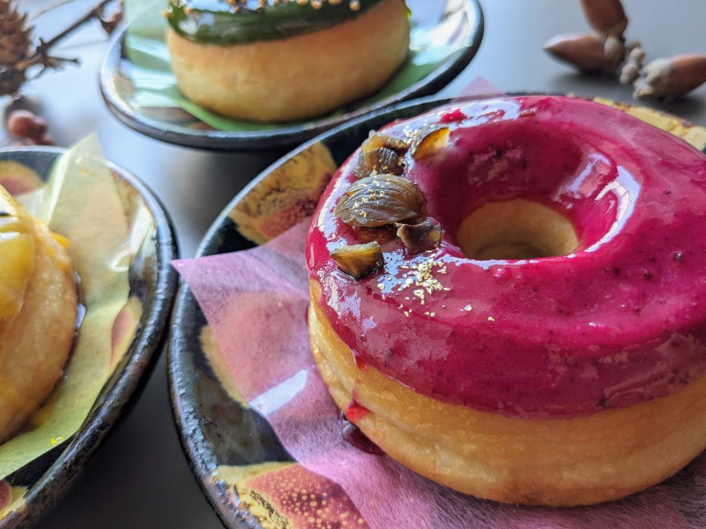 ⽢酸っぱくジューシーなカシスピューレを使ったグレーズに、やさしい甘さのオーガニック甘栗をトッピング。鮮やかなピンクパープルの色合いに金粉をあしらった、見た目も上品で華やかなドーナツに仕上がっています。