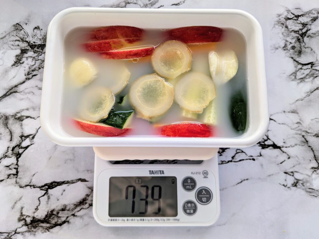 4. 消毒した容器に、米のとぎ汁とカットした野菜・フルーツ・唐辛子を入れ計量する。(容器の重量は除く)