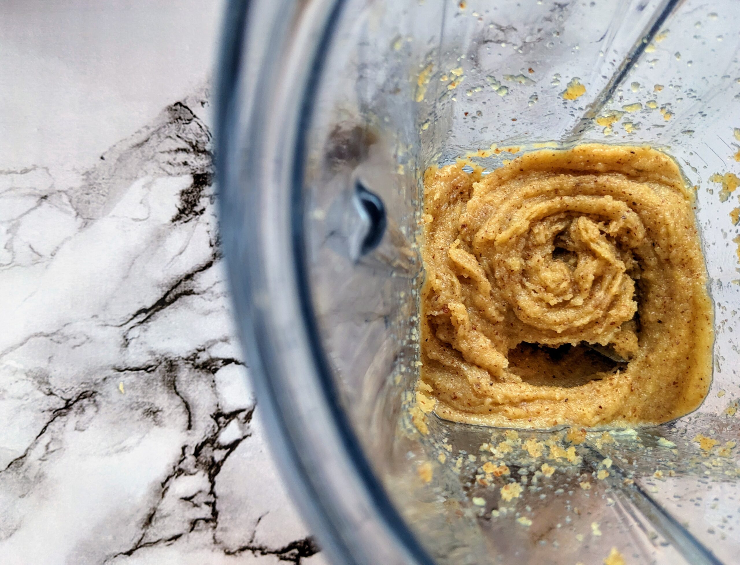 2.甘酒、塩、オリーブオイル大さじ1を加え、さらにペースト状になるまで攪拌する。(アーモンドからもだんだん油が出てきて全体がペースト状の塊のようにまとまってきます。)