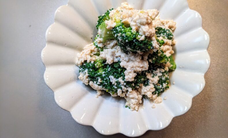 - ブロッコリーは小房に切り分ける。鍋にたっぷりのお湯を沸かし塩を加え、その中にブロッコリーを入れ約3分ほど茹でる。(茹だったらザルにあげ、水っぽくしないために水につけずに粗熱を取る。)
