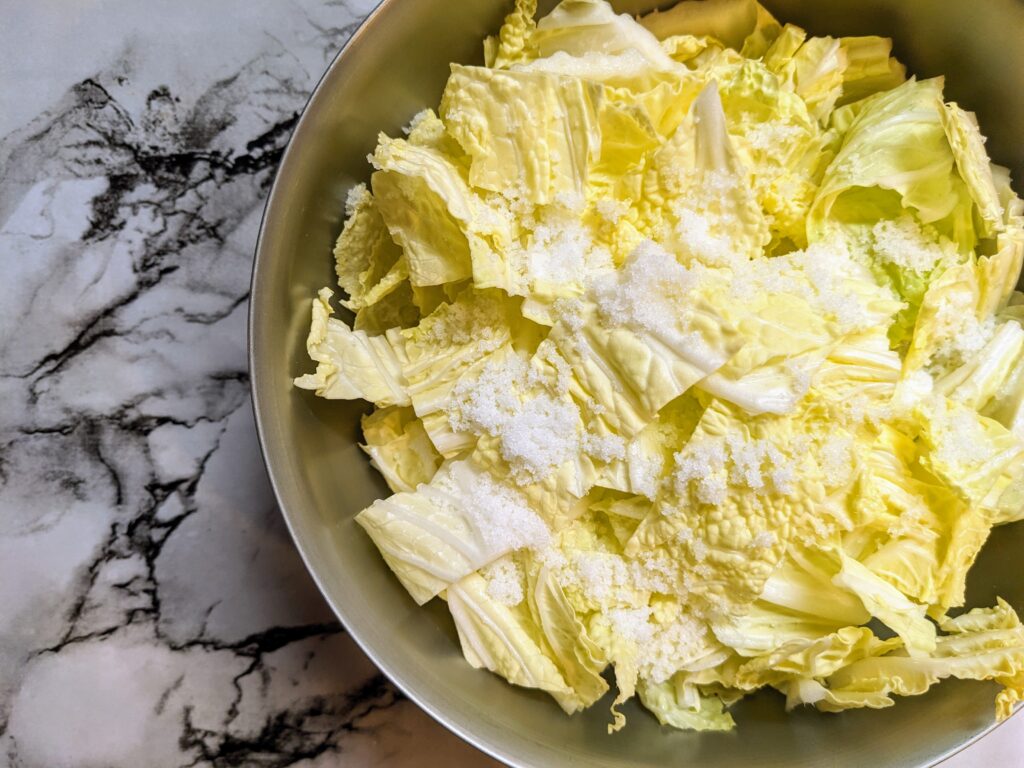2.ボウルに切った白菜と粗塩を加え、白菜から水分が出てくるまで全体をよくもみ込む。