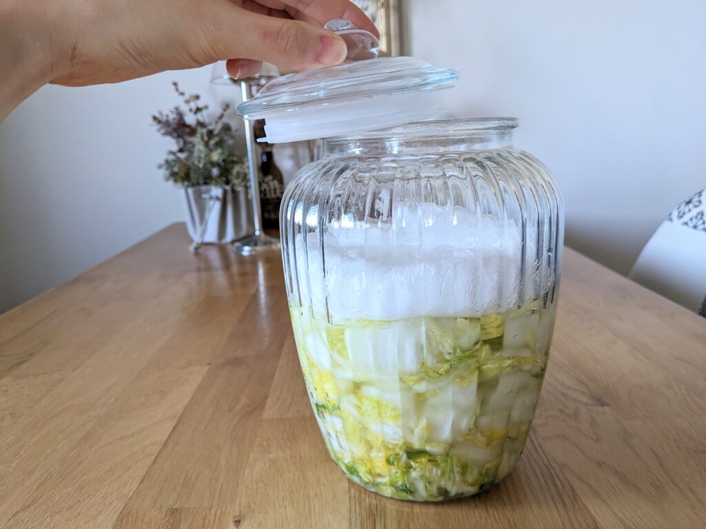 3.消毒した保存容器に白菜をぎゅっと詰め込み(水分も一緒に入れてOK)、空気を抜くようにラップを敷き、その上に重しを乗せる。(重しは袋に塩などを入れて作ると良いです。)