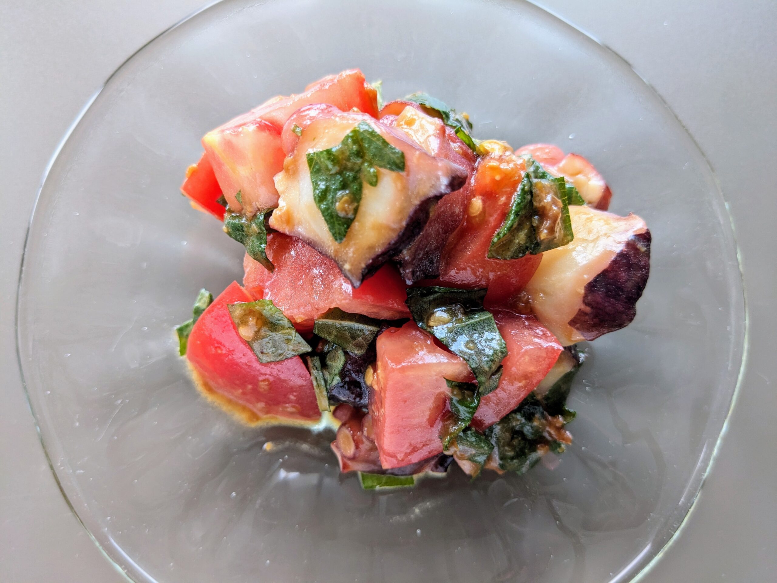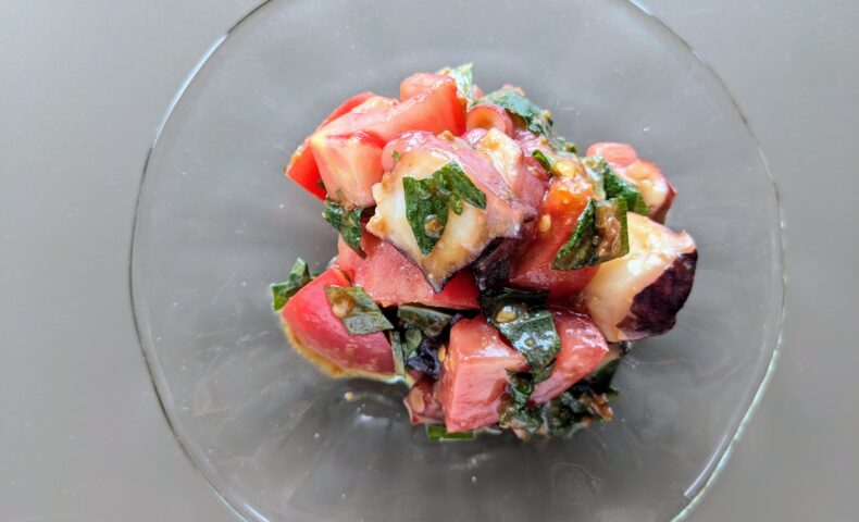 - 切ったタコ、トマト、大葉をマリネ液と和えたら、器に盛り付ける。