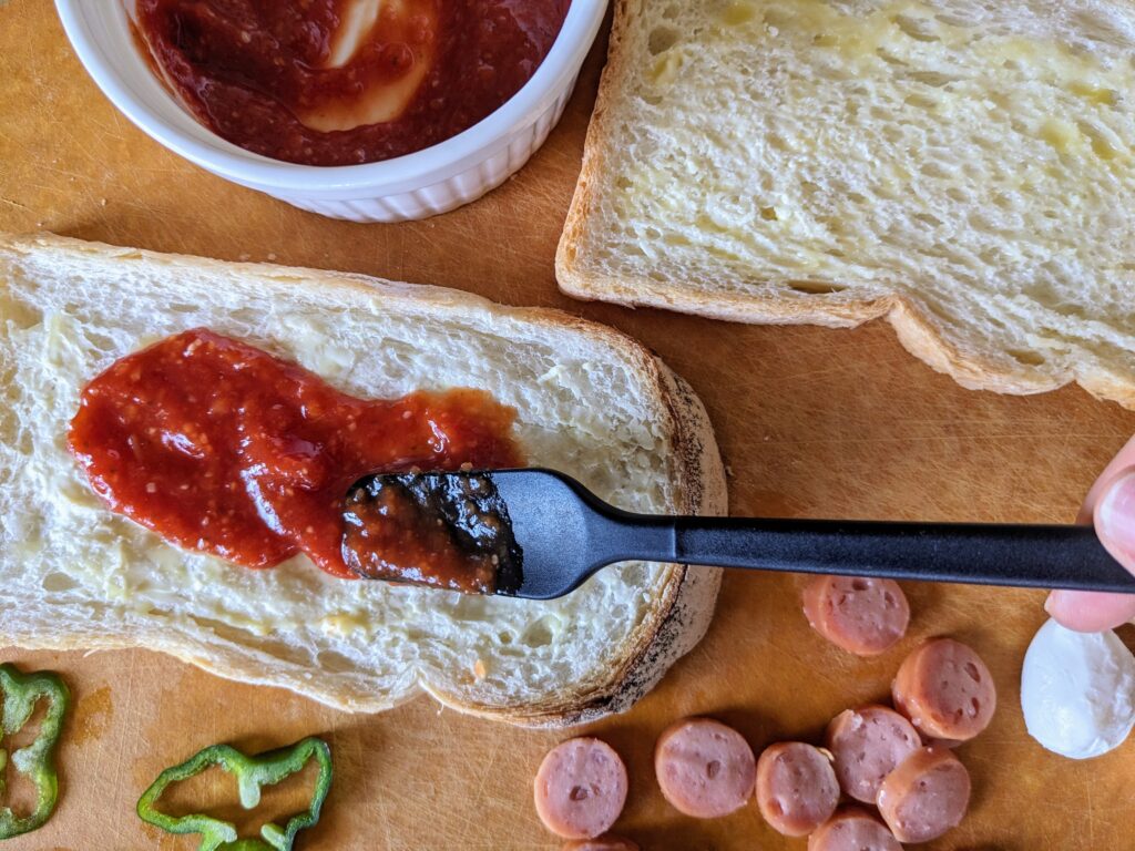 2.食パンに薄くバターを塗り、その上にピザソースを塗る。