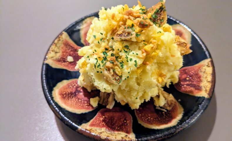 - 竹串などでじゃがいもが柔らかくなったのを確認したら、水をしっかり切り、熱いうちに玉ねぎ麹とすりおろしにんにくを加えて粗めに潰す。