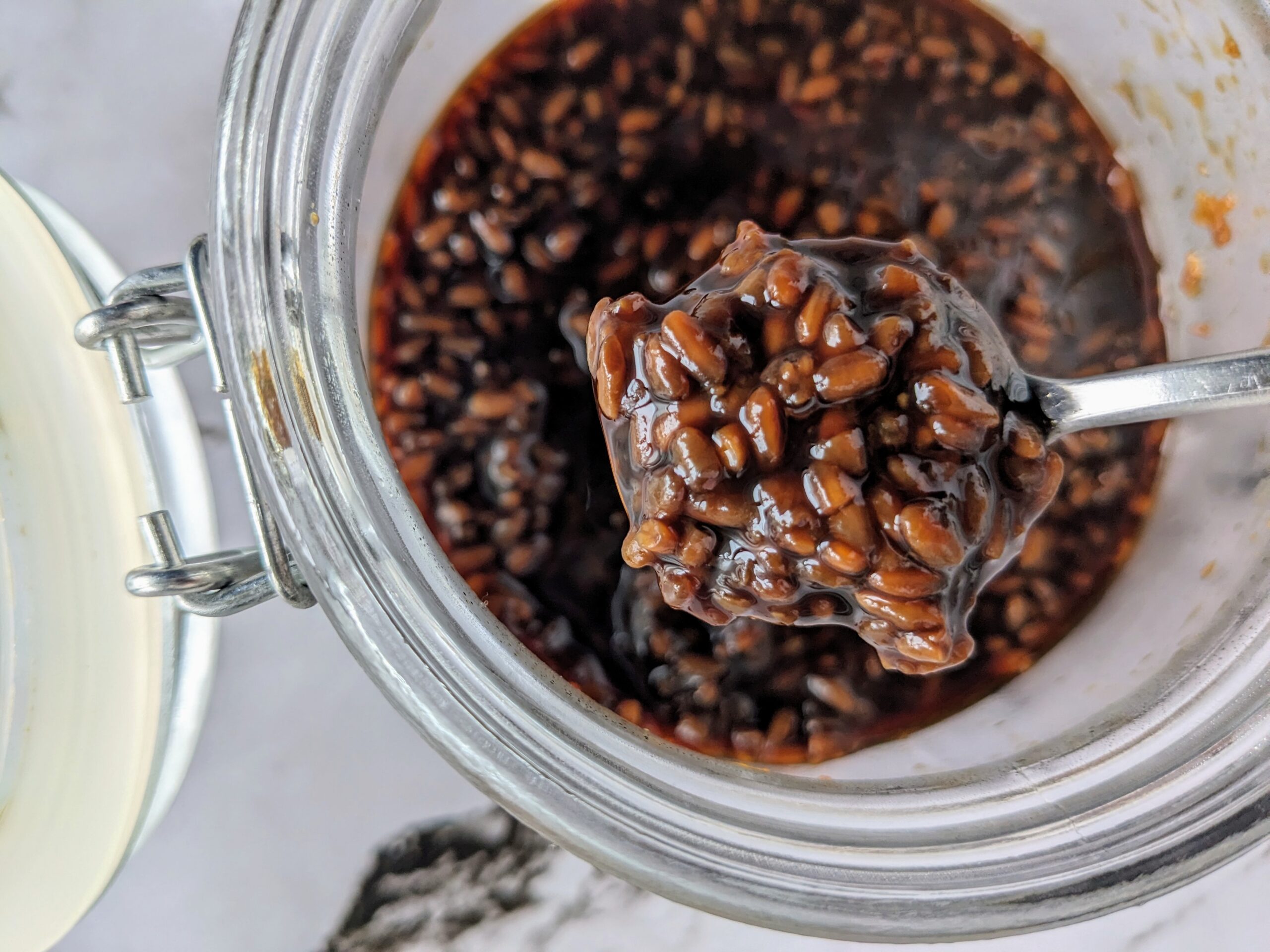 2.常温で1日1回清潔なスプーンで混ぜながら約1週間で完成。(良い香りがしてとろみが出ていたら完成。)水分が少ないと感じる場合は醤油を追加で注いでいただき結構です。