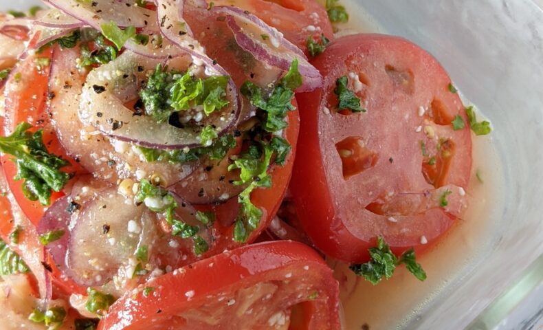 - トマト麹、(オリーブオイル)、レモン汁を加えてドレッシングを作り、1.のトマト、パセリ、水気をよく切った紫玉ねぎと和える。